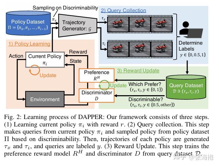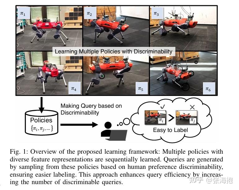 一句话概括?仍然考虑微调 VLA 使其符合人类偏好,所以中间涉及到人类打标签。如果轨迹都是从同一个策略上采样产生的,其实也很难分出好坏。因此这里考虑学多个策略,并且训练一个 discriminator,尽量选择对比比较强的两条轨迹来给人类评判。