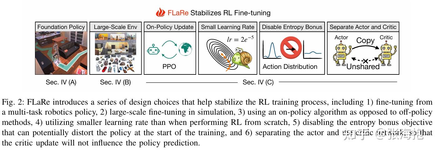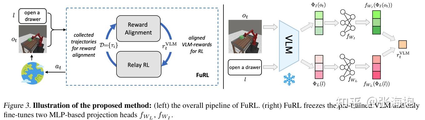 由此,这里调研到的很多工作其实都是围绕这些点中的一个或者多个展开的。比如针对稀疏奖励问题,除了可以设计一些规则(比如成功的轨迹中越靠后越好)来把奖励加密之外,我们还可以使用专家数据做 warm-up 或者 KL regularization 。再或者,可以结合大模型,用预训练好的 VLM 来为 RL 提供更为密集的奖励。