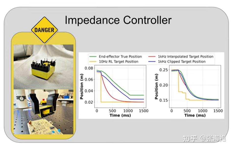 其中 e 表示当前位姿和目标位姿的差值。第一项是主要的控制项,第二项为了抑制震荡,后面还有前馈补偿、动态补偿、离心力补偿等。在此基础上,文章还对于误差 e 做了截断,可以有效防止任务执行的时候损坏道具。比如下图中左边的曲线就展示了如果某个位置被挡住的话,就不会完全执行。