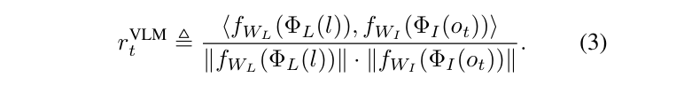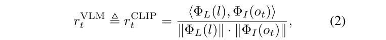 具体怎么用 VLM 产生 reward 呢?文章先考虑了一个简单的做法:在稀疏奖励之外加入了 VLM 产生的奖励,VLM 的奖励就是 CLIP 中当前图像的表示和语言指令的表示的 cosine similarity。