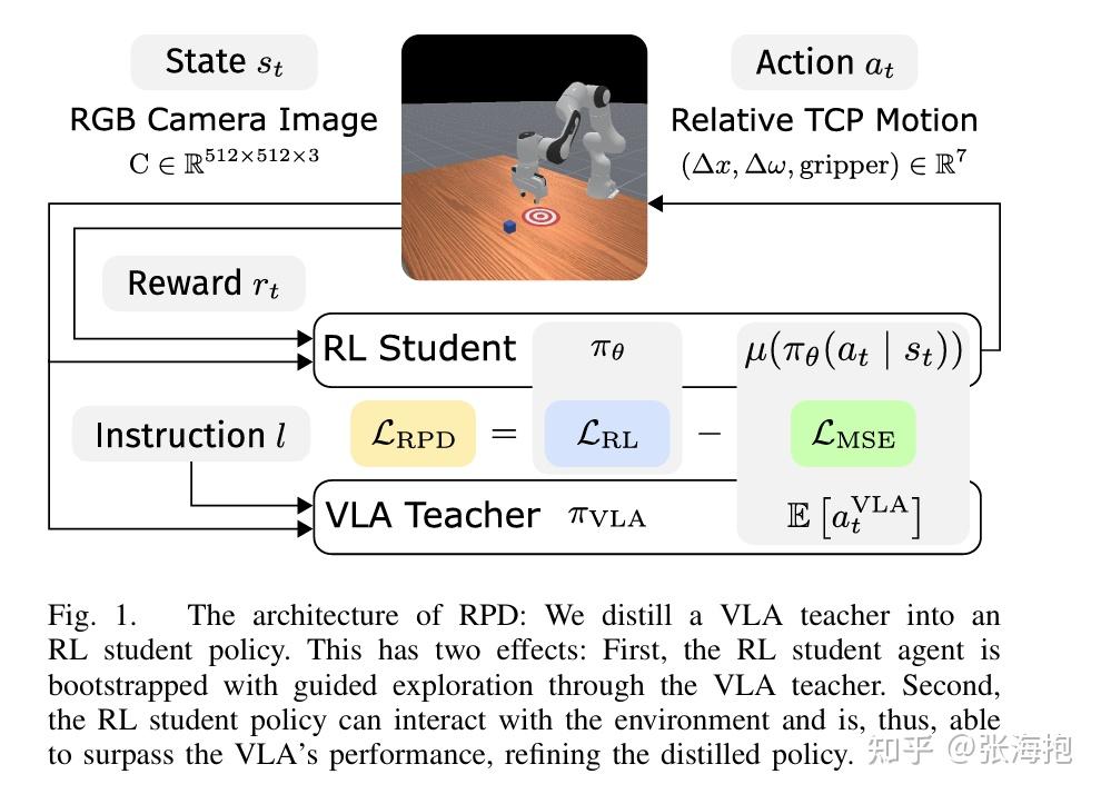 一句话概括?与其在 VLA 上做 RL,不如在 VLA 的引导下重新训一个 RL student 来做强化学习,这样效率更高。我猜新的 RL student 应该结构更小一些,但文中没有找到相关描述。