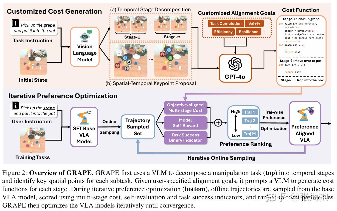 一句话概括?基于有好有坏的数据,对于 VLA 做类似 DPO 的优化;着重考虑使用 GPT 来获取分阶段的奖励函数。