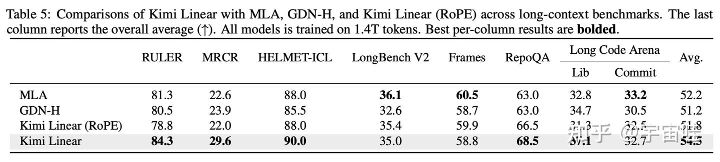 - 长文本评测:在处理128k长度的文本时,Kimi Linear的优势更加明显,平均分(Avg.)最高,达到了54.5,显著领先。