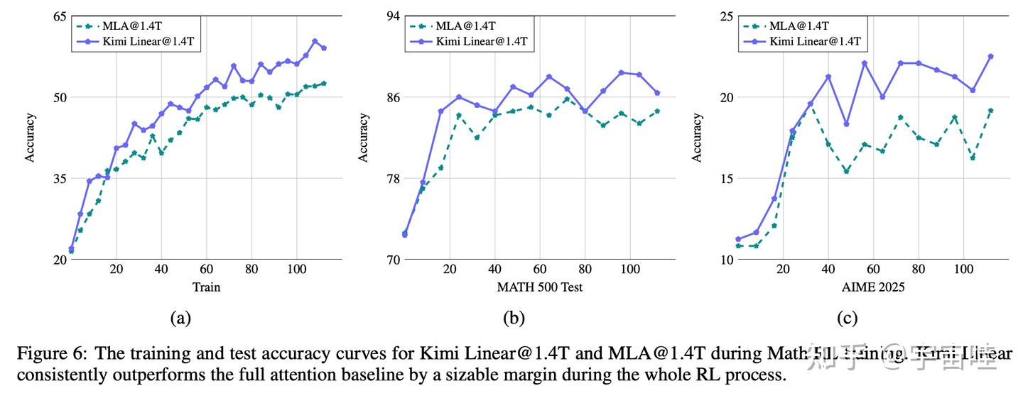 这张图展示了在数学RL训练过程中,Kimi Linear(蓝线)的准确率增长速度和最终达到的高度,都明显超过了MLA(绿线),证明了其架构在复杂推理任务上的学习效率和潜力。