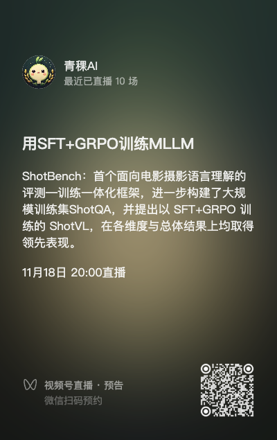11月18日(周二)晚8点,青稞Talk 第90期,同济大学博士生刘洪博,将直播分享《ShotBench: 面向增强MLLM摄影语言理解能力的训练与评估体系》。