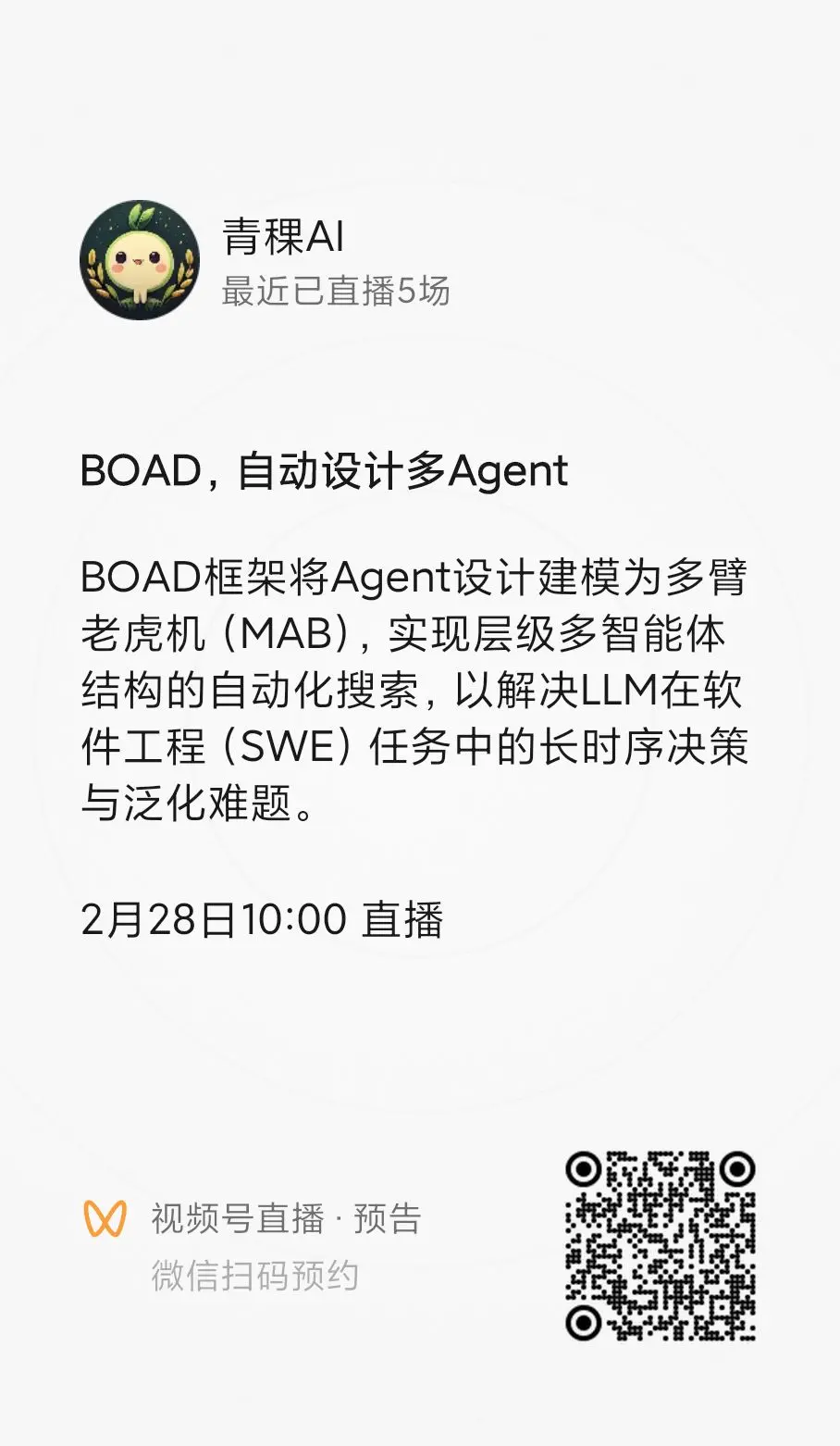 2月28日(周六)上午10点,青稞社区和减论平台将联合组织青稞Talk 第108期,麻省理工学院(MIT)本科生ris Xu,将直播分享《BOAD:引入多臂老虎机,自动化搜索层级结构的多 Agent 架构设计》。