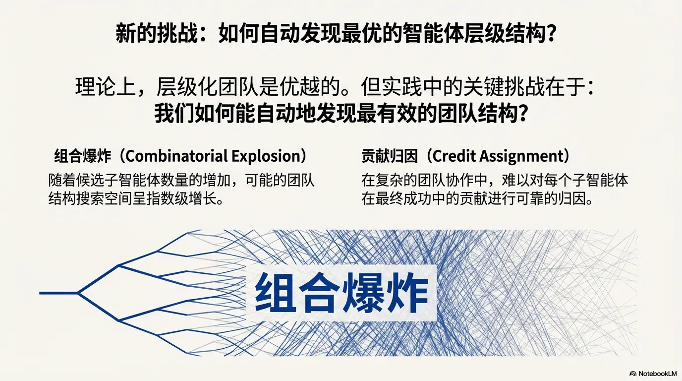 但是关键挑战在于怎么自动发现有效的层级结构:当子智能体越多,结构搜索空间呈组合爆炸,且难以对各子智能体进行可靠的贡献归因。