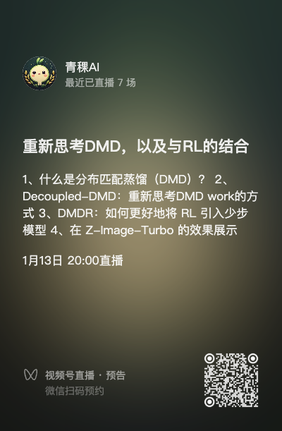 1月13日(周二)晚8点,青稞社区和减论平台将联合组织青稞Talk 第103期,阿里巴巴通义实验室实习生、西北工业大学本科&香港科技大学预备博士姜登阳,将直播分享《Decoupled DMD & DMDR: 在扩散模型步数蒸馏的实践及 Z-Image-Turbo 应用》。