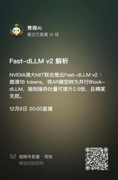 12月9日(周二)晚8点,青稞Talk 第95期,香港大学MMLab博士生吴成岳,将再次分享《Fast-dLLM v2:高效训练推理的块扩散大语言模型框架》。