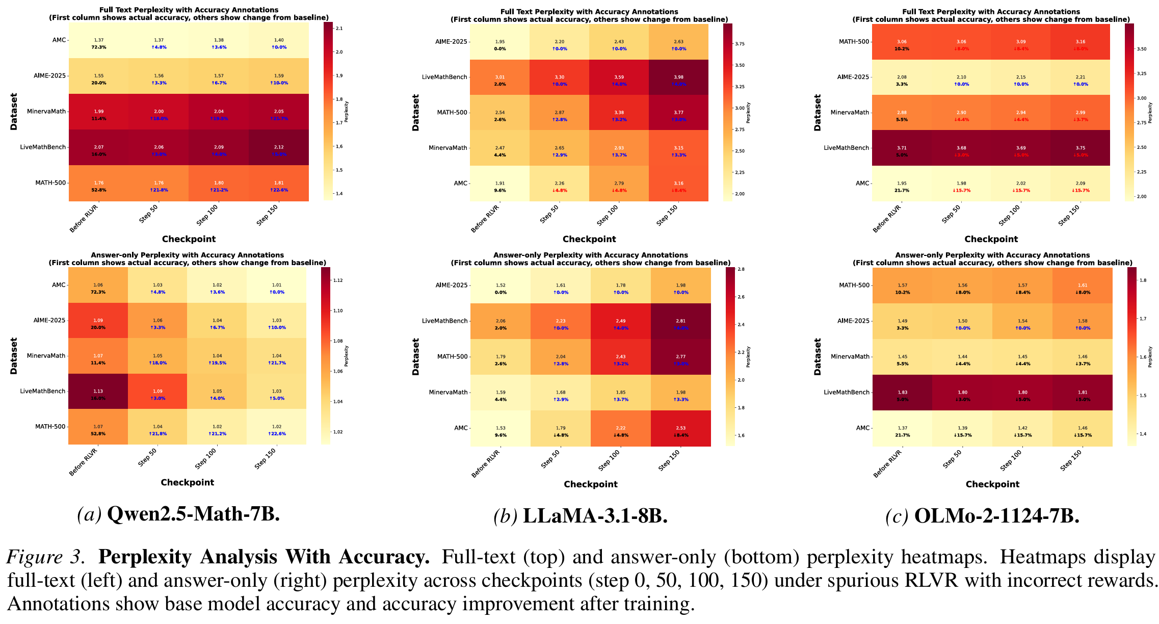 我们首先观察到一个违反直觉的现象:在虚假的RLVR训练过程中,模型对答案的困惑度(Perplexity)持续下降,但对问题提示的困惑度却不降反升。