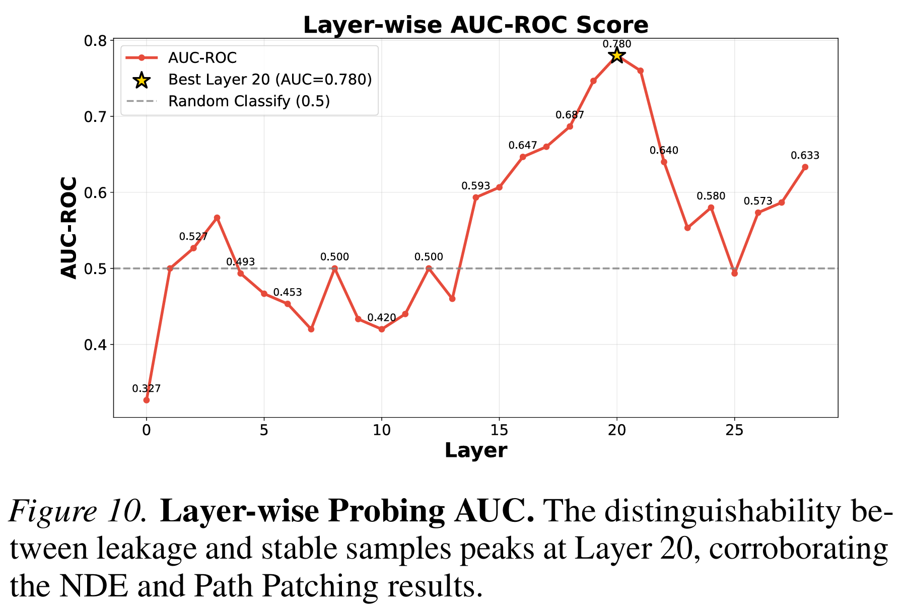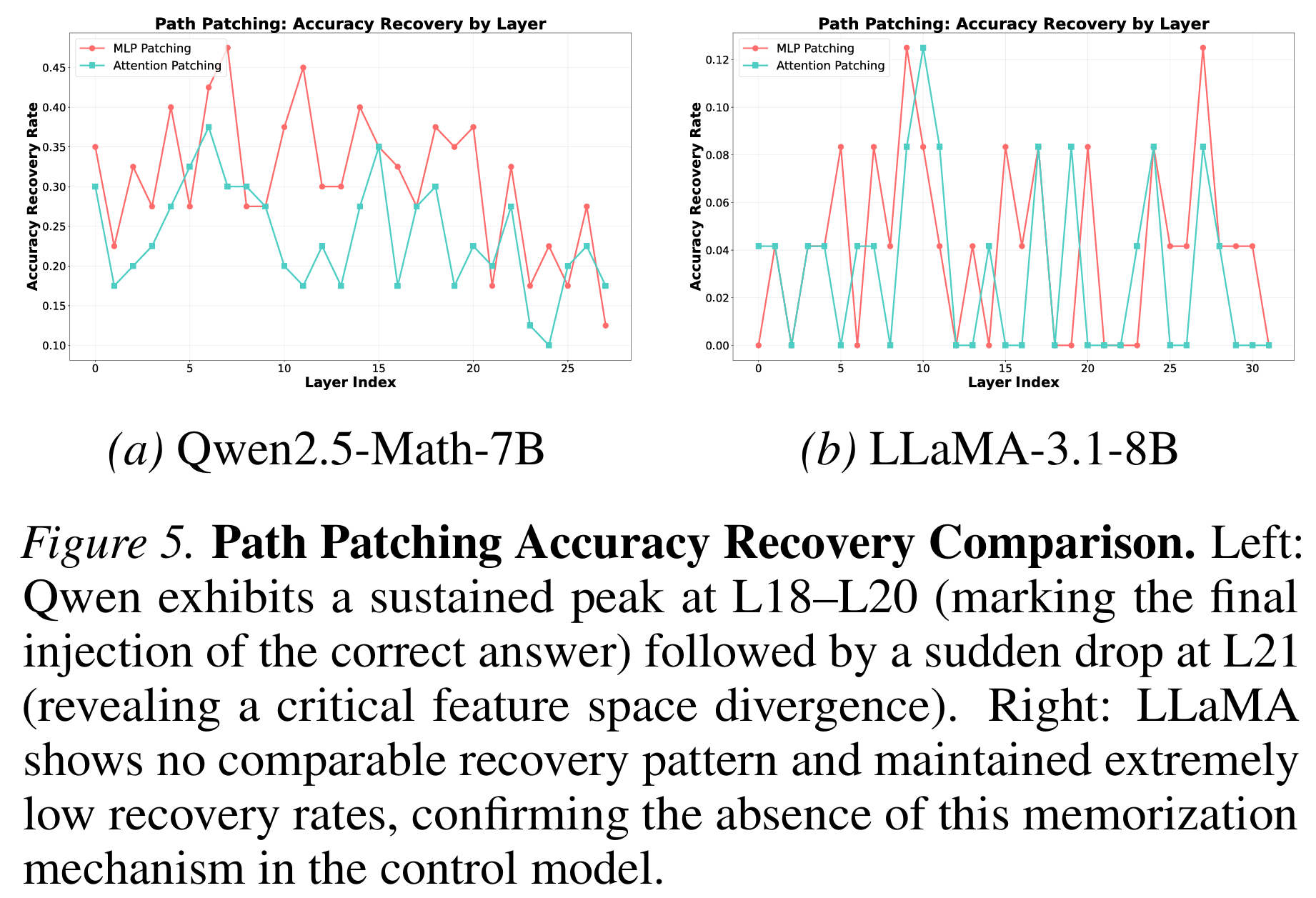通过在不同层之间交换激活值,我们发现:当修补第18-20层的MLP时,模型能够恢复对泄露样本的正确回答;而修补第21层之后,这种恢复能力骤然下降。
