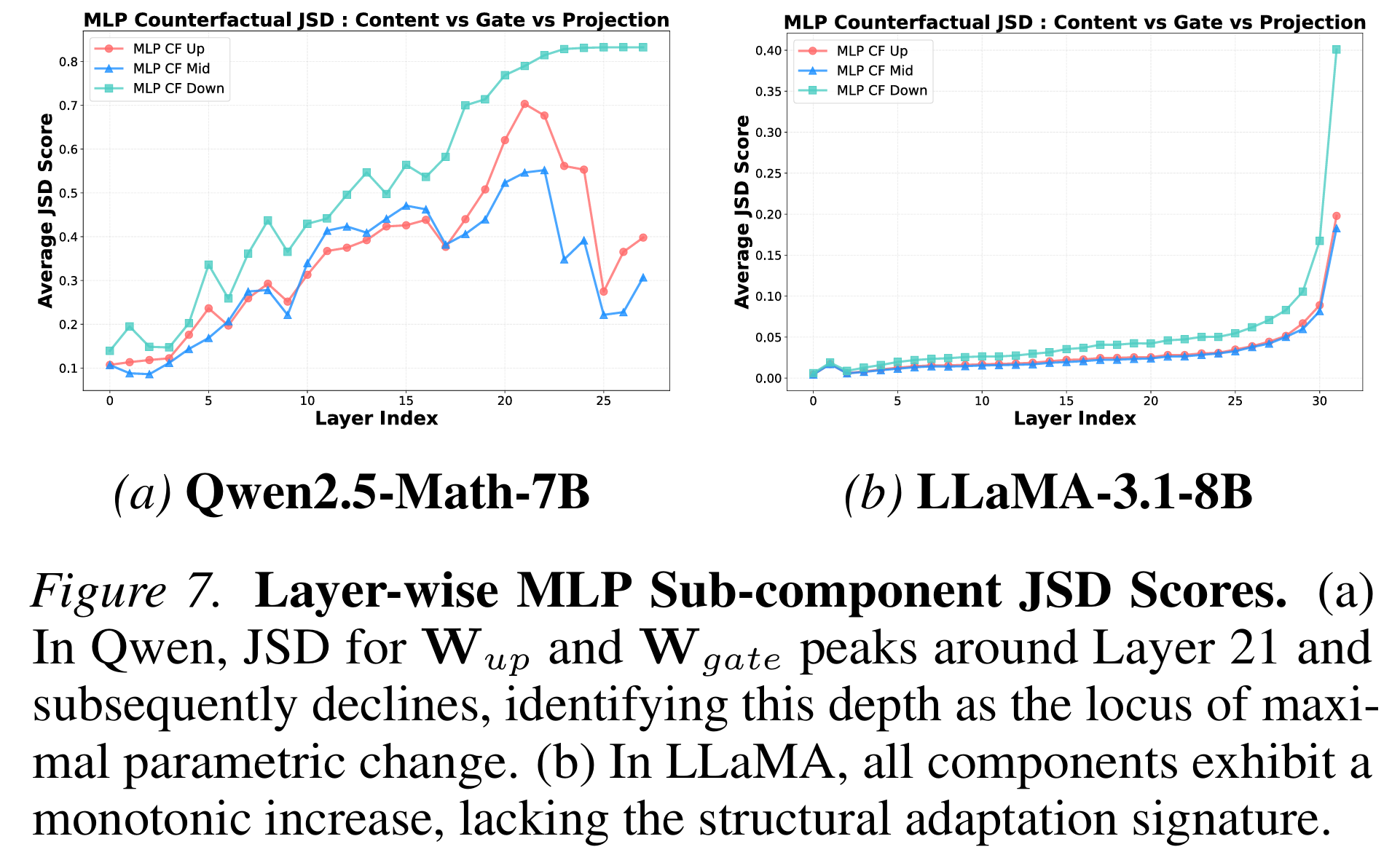 通过计算Jensen-Shannon散度(JSD),我们量化了每一层对最终输出分布的贡献变化。结果显示:第21-22层的MLP子组件(W_up和W_gate)贡献值达到了顶峰。