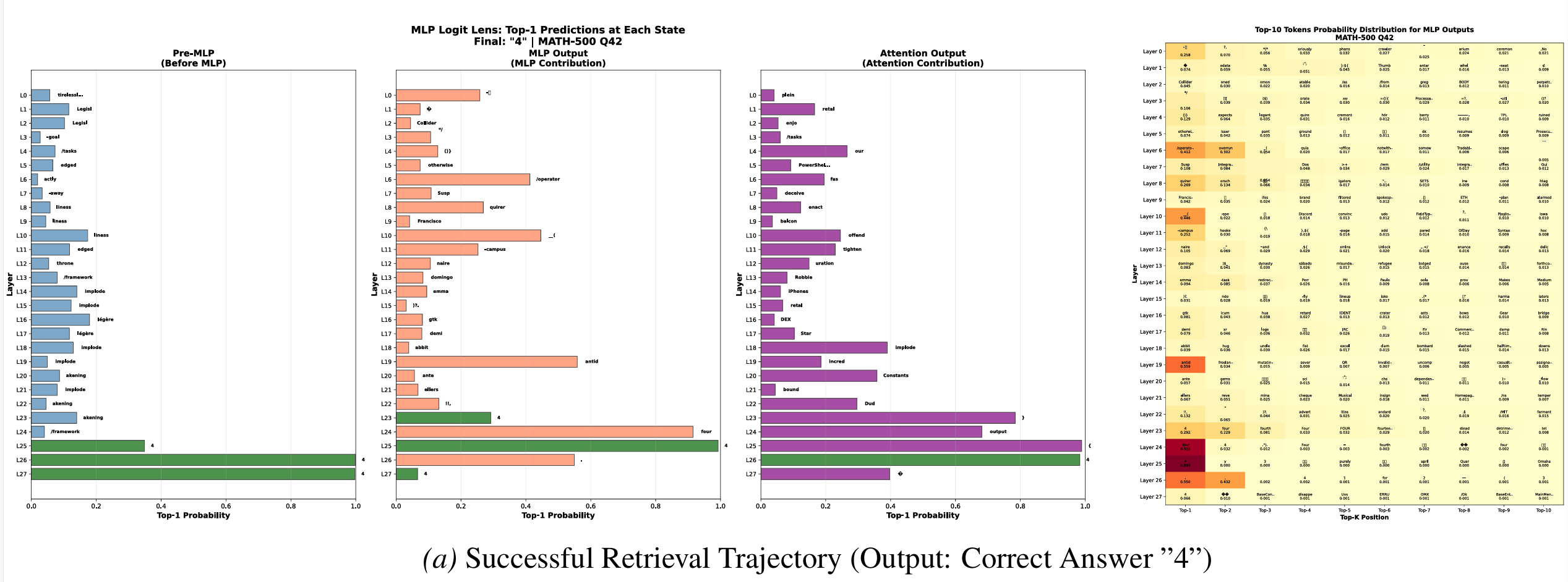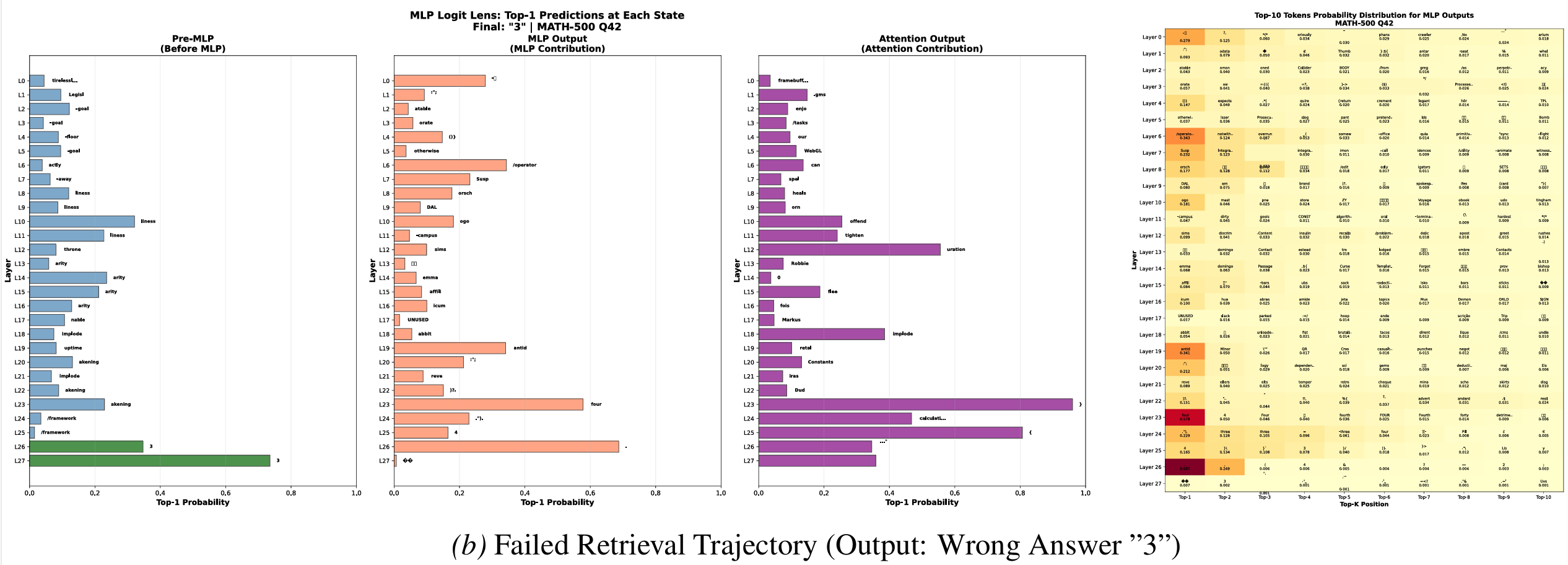 更令人惊讶的是:即使在模型最终输出错误答案的失败案例中,第23-25层的MLP仍然试图注入正确答案——只是因为第19层的初始信号太弱,后续层无法扭转输出。