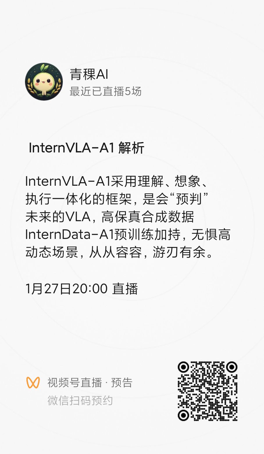 1月27日(周二)晚8点,青稞社区和减论平台将联合组织青稞Talk 第105期,上海人工智能实验室具身智能中心青年科学家曾嘉,将直播分享《InternVLA-A1,虚实贯通:理解、生成、执行一体化的具身操作大模型》。