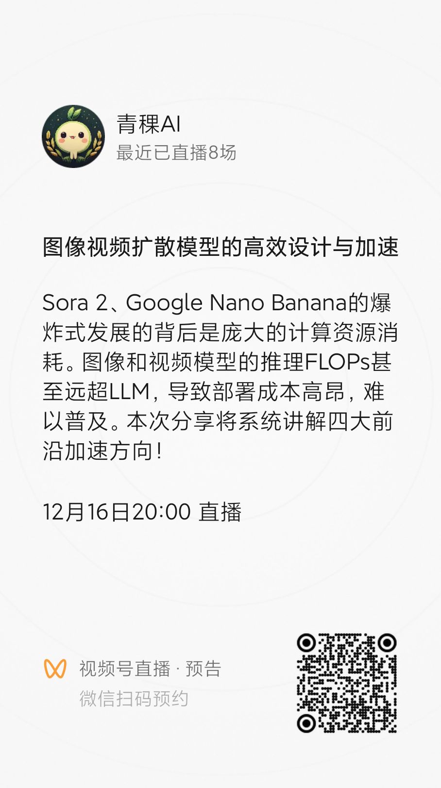 12月16日(周二)晚8点,青稞Talk 第98期,香港大学MMLab博士生陈俊松,将直播分享《SANA-Series:探索图像视频扩散模型的高效设计与加速》。