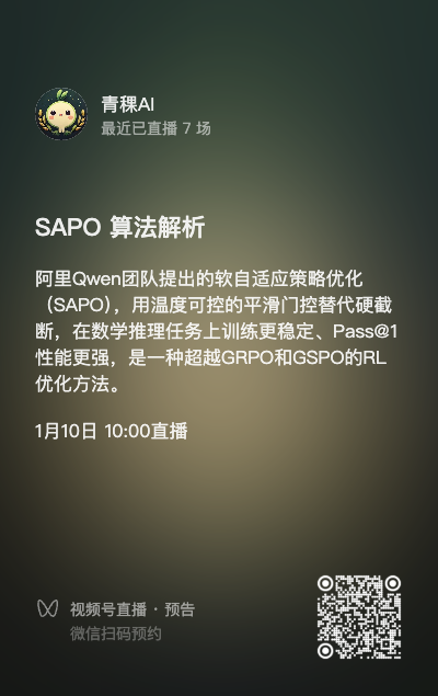 1月10日(周六)上午10点,青稞社区和减论平台将联合组织青稞Talk 第102期,SAPO 作者、通义千问算法工程师高畅,将直播分享《从 TRPO 到 SAPO:大模型 RL 算法演进》。