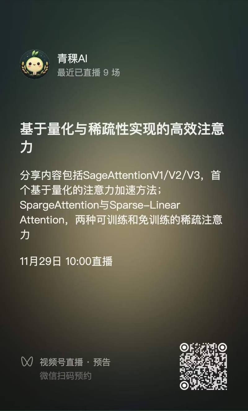 11月29日(周六)上午10点,青稞社区和减论平台将联组织青稞Talk 第93期,并邀请到清华大学博士生张金涛,直播分享《SageAttention & Sparse-Linear Attention & SpargeAttention:通过量化与稀疏性实现高效注意力机制》。