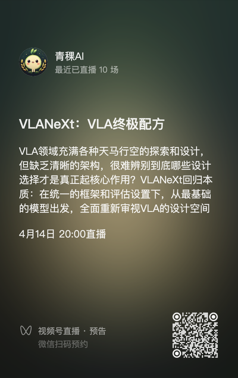 4月14日(周二)晚8点,青稞Talk 第120期,新加坡南洋理工大学 MMLab 博士生伍晓鸣,将直播分享《VLANeXt:12条设计准则,从入门到精通的 VLA 终极“配方”》。